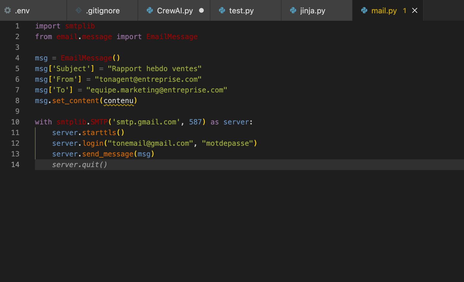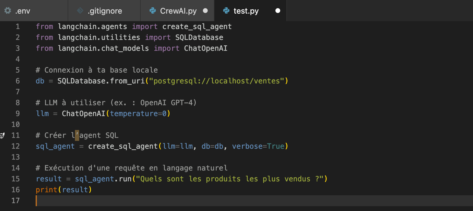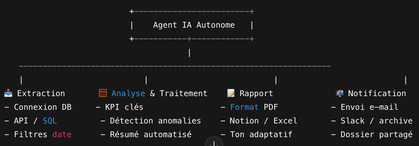 Par exemple, dans un contexte e-commerce, un agent IA peut chaque semaine extraire automatiquement les ventes de la base de données, détecter les anomalies avec Pandas, rédiger un rapport clair, et l’envoyer par e-mail à l’équipe marketing, sans intervention humaine.