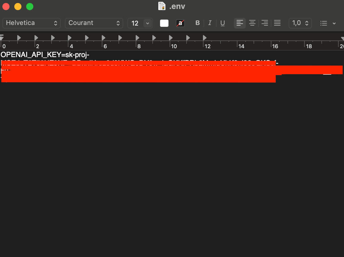 Ensuite, ajoutez votre clé OpenAI et vos accès API dans un fichier .env. Pour cela, ouvrez simplement un éditeur (VSCode, Sublime…) et créez un fichier nommé .env, ou dans votre terminal directement grâce à cette commande :