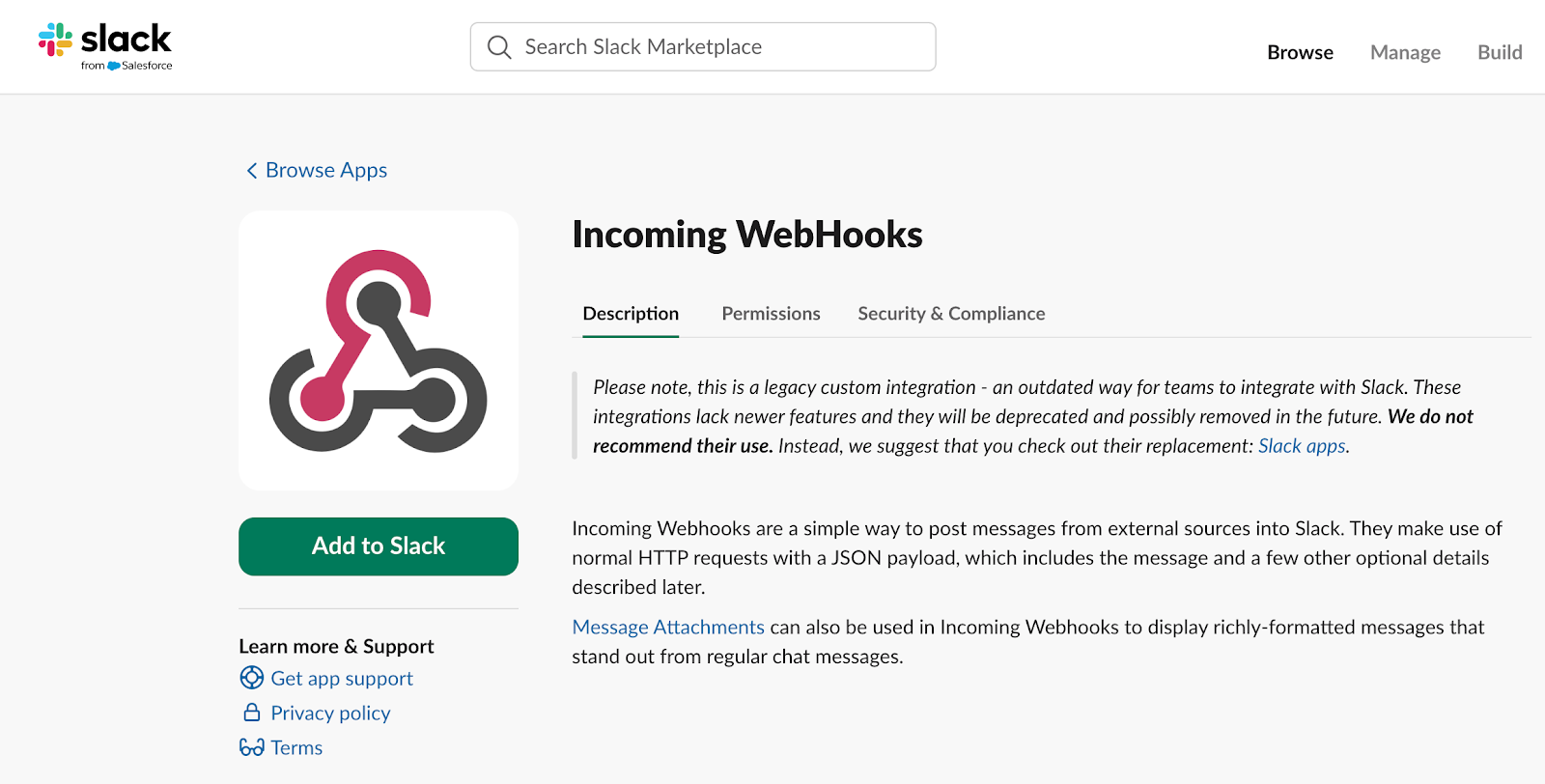 - Créer un webhook Slack dans un canal (Slack → Intégrations → Webhook entrant). Au préalable, il faut télécharger le module via ce lien.