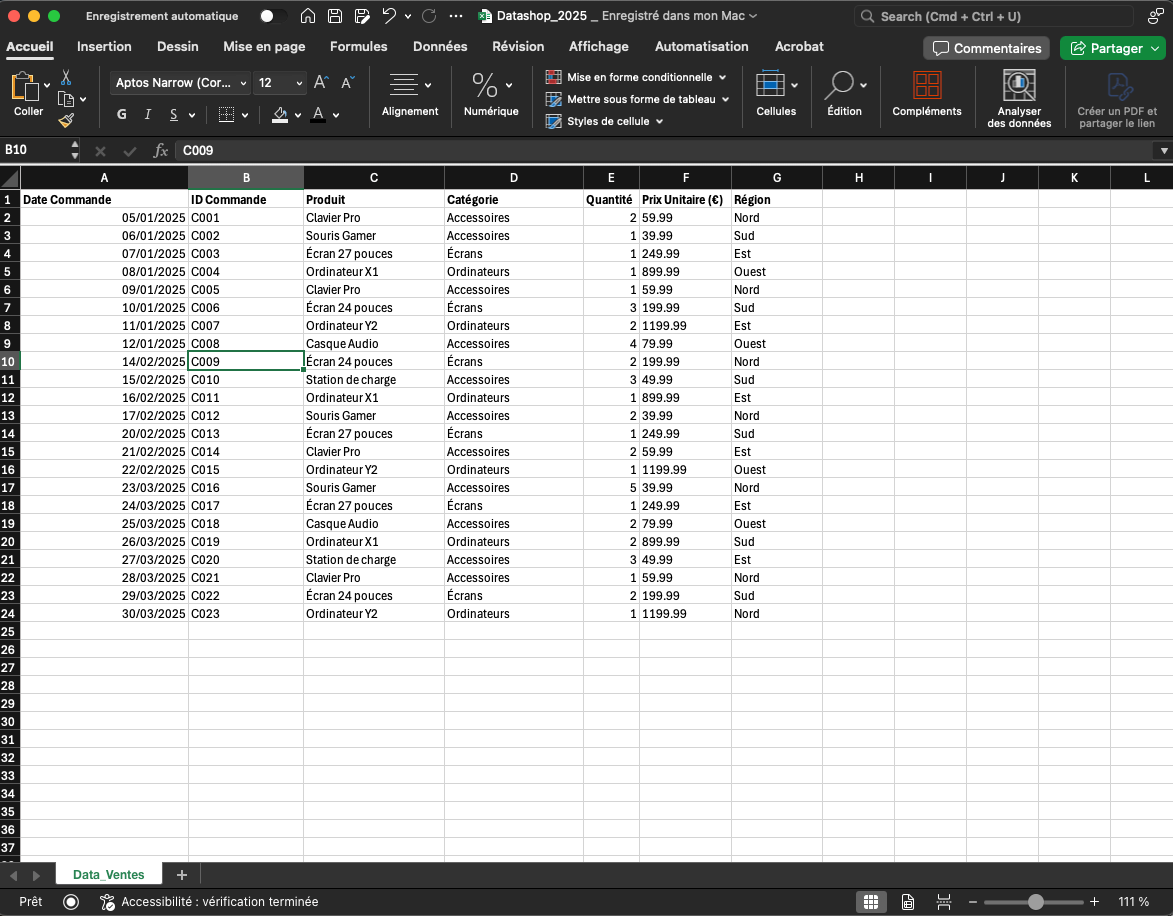 Voici notre structure pour notre table de ventes Data_Ventes, qui rassemble toutes les données collectées sur DataShop depuis janvier 2025 :