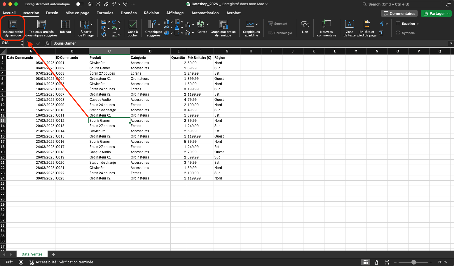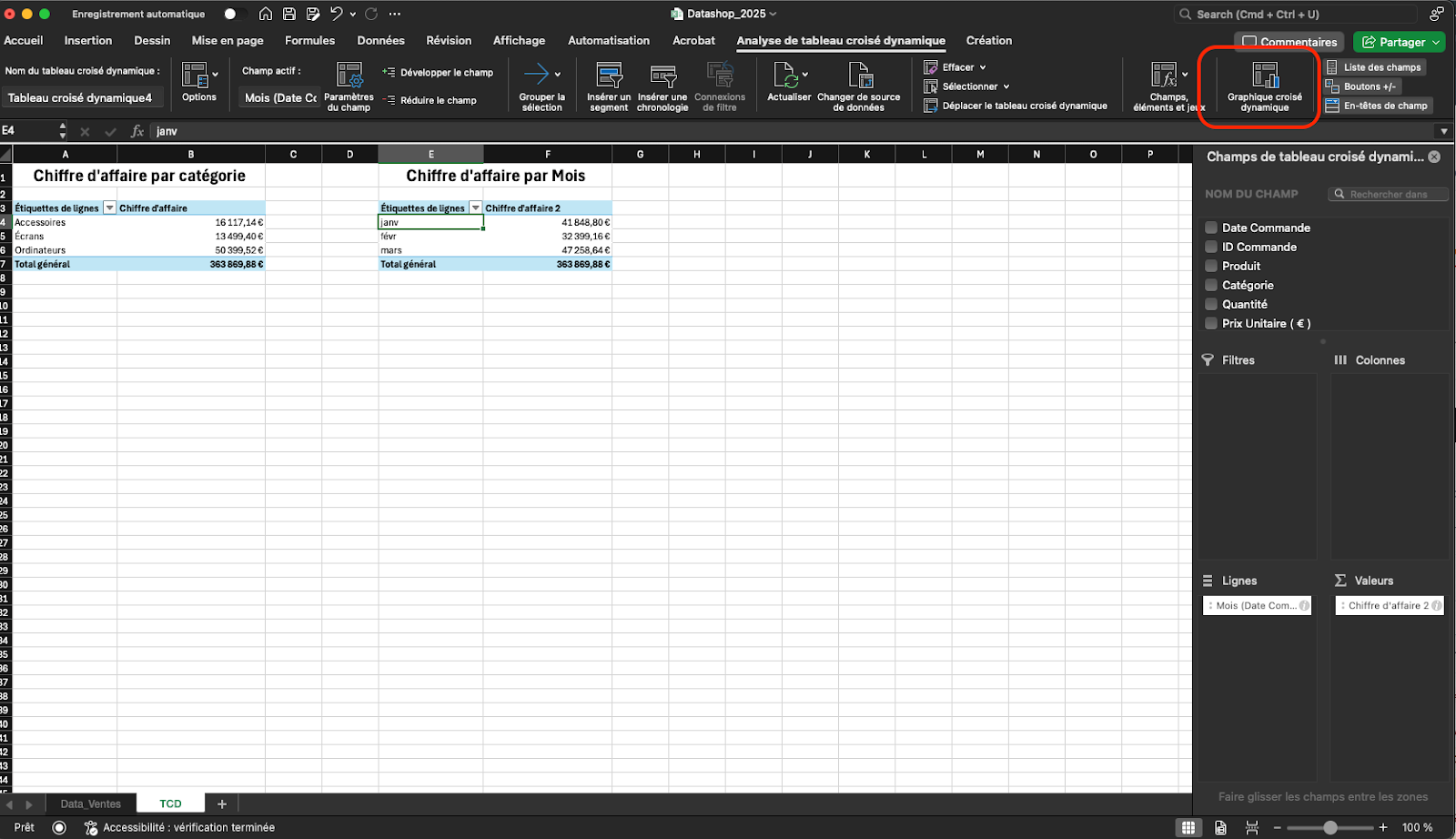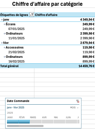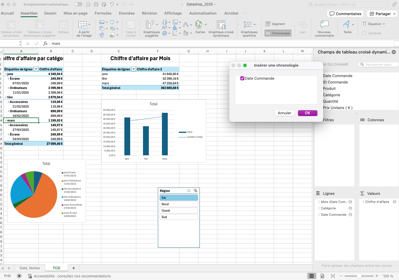 Dans DataShop, pour permettre une analyse par mois, sélectionnez un TCD contenant la date de commande, puis insérez une chronologie (Insertion → Chronologie → Date Commande).
