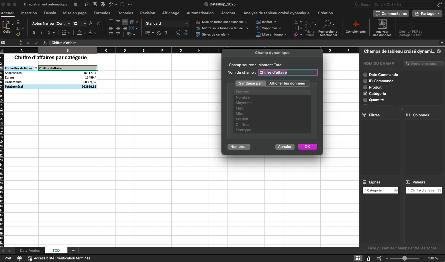 Excel se base alors sur les champs existants pour générer ce calcul à la volée, sans modifier la source. Une fois le champ ajouté, il apparaît dans la zone valeurs du TCD, et affiche automatiquement le chiffre d’affaires total par catégorie.