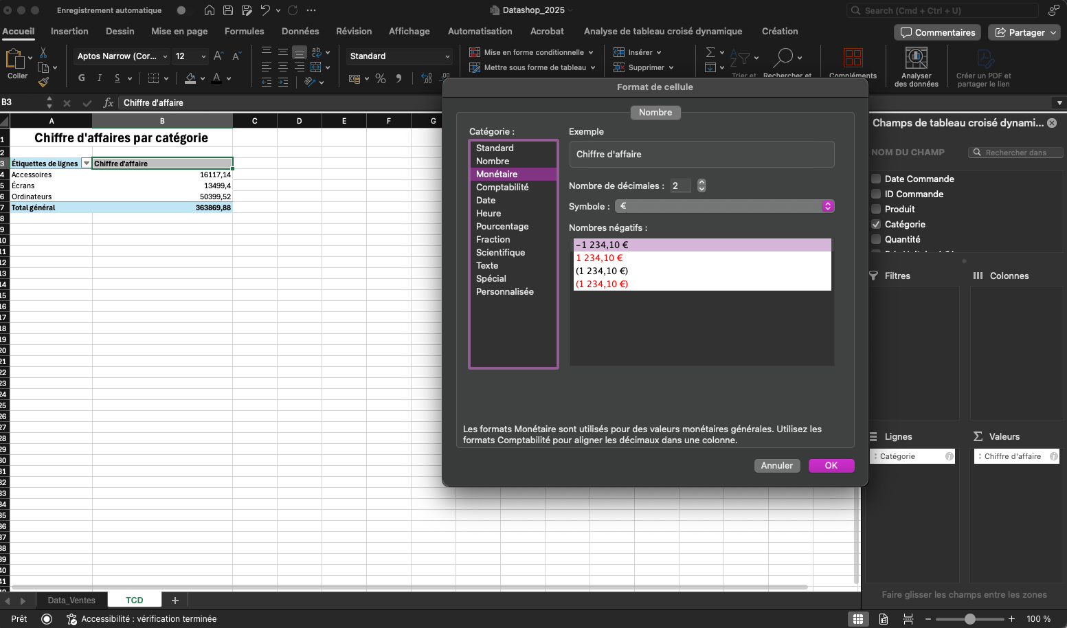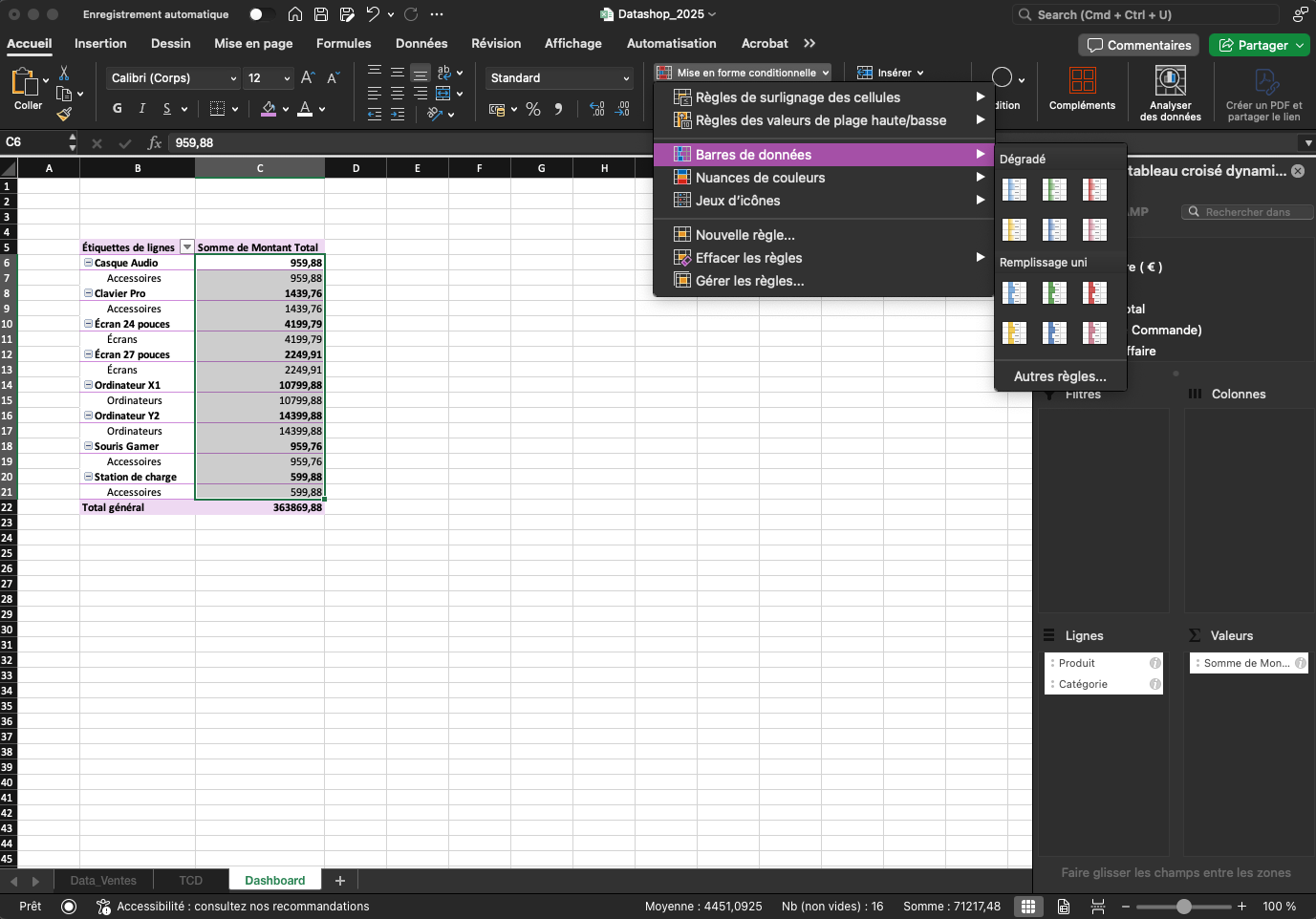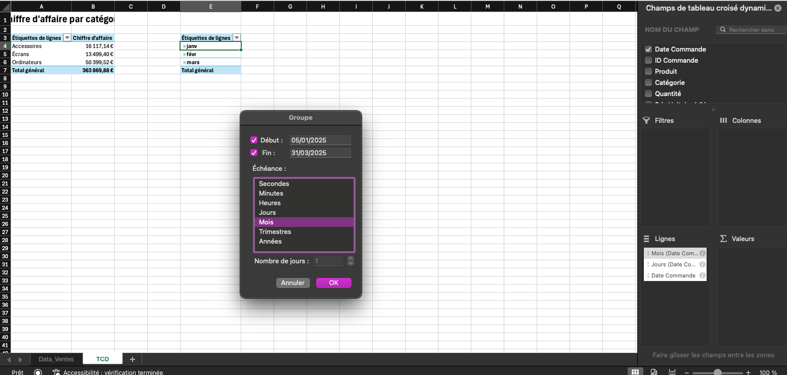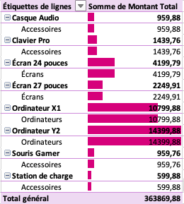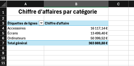 Ce TCD offre une première lecture essentielle : on identifie très rapidement quelles catégories (Accessoires, Écrans, Ordinateurs…) génèrent le plus de chiffre d'affaire.