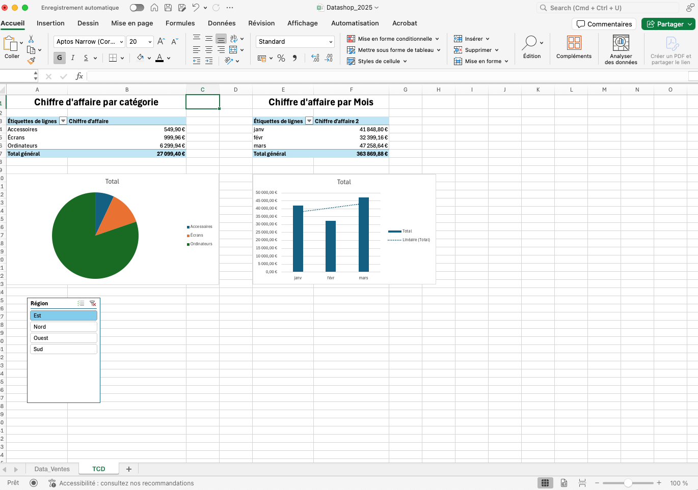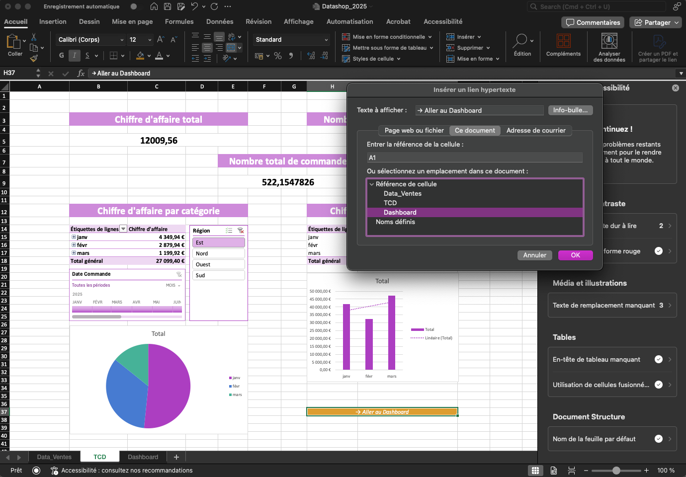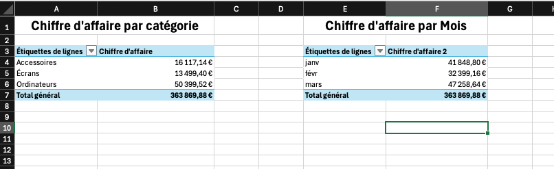 Avant de considérer votre dashboard terminé, il faut s’assurer que tous les TCD et graphiques sont bien reliés à la table Data_Ventes.