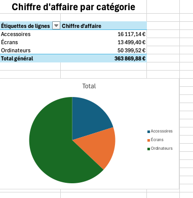 En parallèle, on génère un graphique en secteurs basé sur le TCD par catégorie pour montrer la part de chaque type de produit dans le chiffre d’affaires total.