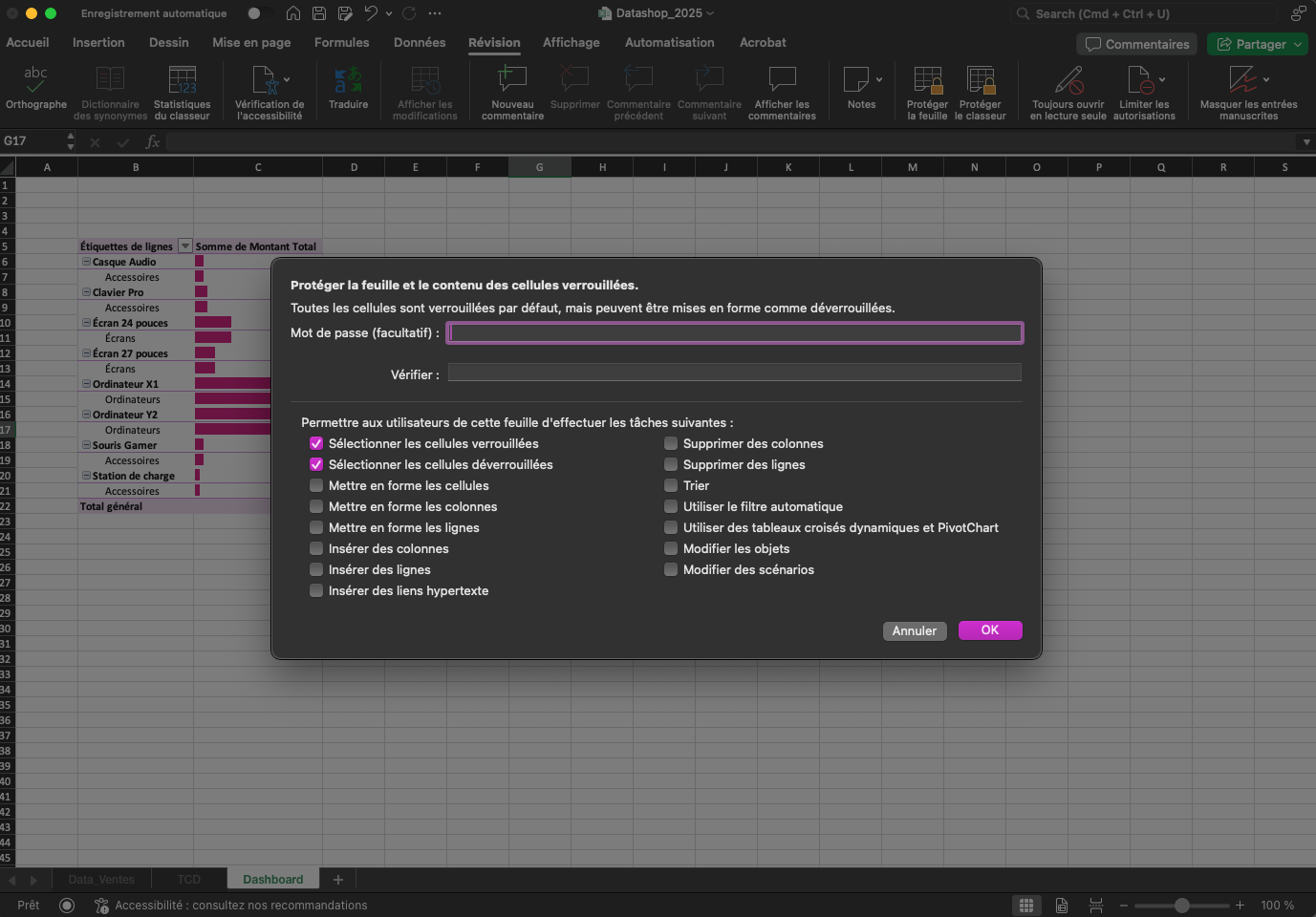 Une fois votre tableau de bord terminé, protégez-le pour éviter les erreurs de manipulation. Allez dans l’onglet "Révision" → "Protéger la feuille", et choisissez de verrouiller certaines cellules tout en laissant les segments ou filtres actifs.