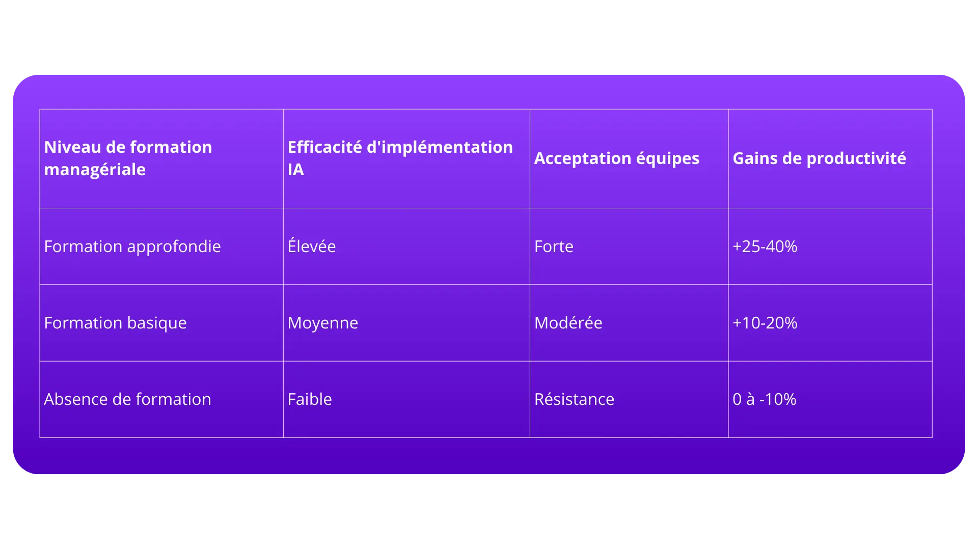 La relation entre formation managériale à l'IA et gains de productivité s'avère conditionnelle plutôt qu'automatique. La formation agit comme un multiplicateur de valeur organisationnelle à condition que l'appropriation technologique soit correctement comprise, ciblée et intégrée dans les processus existants.
