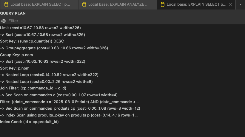 En analysant le plan affiché dans SQLTools, nous voyons que PostgreSQL commence par appliquer la clause LIMIT 10. Cela est visible avec la ligne Limit (cost=10.67..10.68 rows=2 width=326). Avant d’appliquer cette limite, la base trie les résultats en utilisant la somme des quantités commandées, conformément à l’ordre demandé par ORDER BY SUM(cp.quantite) DESC.