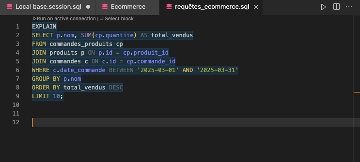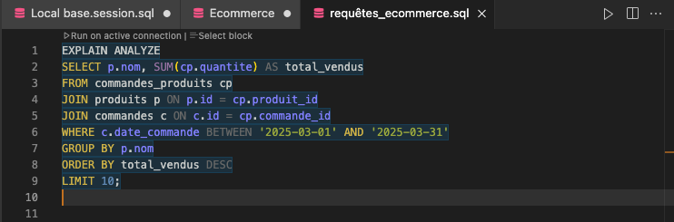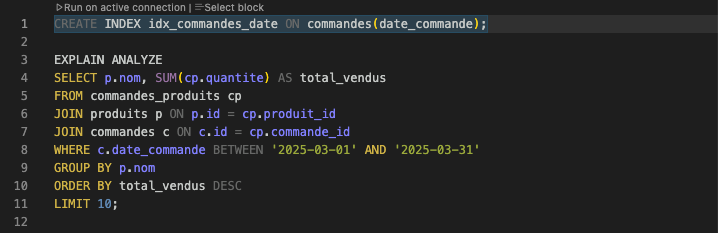 On cherche à optimiser une requête SQL qui retourne les produits les plus vendus en mars 2025.