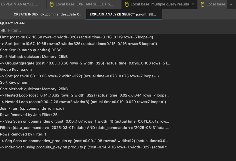 Toutefois, nous remarquons que le moteur PostgreSQL effectue un balayage complet de la table commandes pour filtrer sur la période de mars 2025, ce qui pourrait devenir problématique à plus grande échelle.